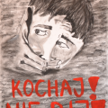 Koło plastyczne zawiesiło wykonywanie zadań wynikających z harmonogramu, by skupić się nad zadaniami związanymi z Dniem zapobiegania przemocy. Wychowankowie Paweł i Artur pod opieką wychowawcy p. Artura chcieli wykonać plakat techniką malarską. Efekt ich działań jest czytelny, wyraźny i zdecydowany. Na tle zniewolonego dziecka jest napis Kochaj - Nie bij. Krótkie, bijące w oczy i serce.
