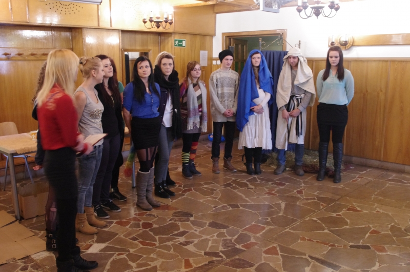 I właśnie nietypowy upominek, wychowankom naszego zakładu, postanowili sprawić uczniowie III klasy zaprzyjaźnionego technikum. W podziękowaniu za dotychczasowe zaproszenia grupy teatralnej „Nad niebem”, przygotowali oni przedstawienie jasełkowe, które w dniu 19 grudnia przedstawili w naszej placówce. W krótkich scenkach, pokazali oni na czym polega prawdziwe Boże Narodzenie. Bóg nie przyszedł w luksusowych warunkach, ale w ubogiej, śmierdzącej grocie. Tak samo dzisiaj, nie liczą się dla niego warunki zewnętrzne, ale serce człowieka. I do otwarcia tego serca na Boga i drugiego człowieka, zapraszali w składanych życzeniach uczniowie.
