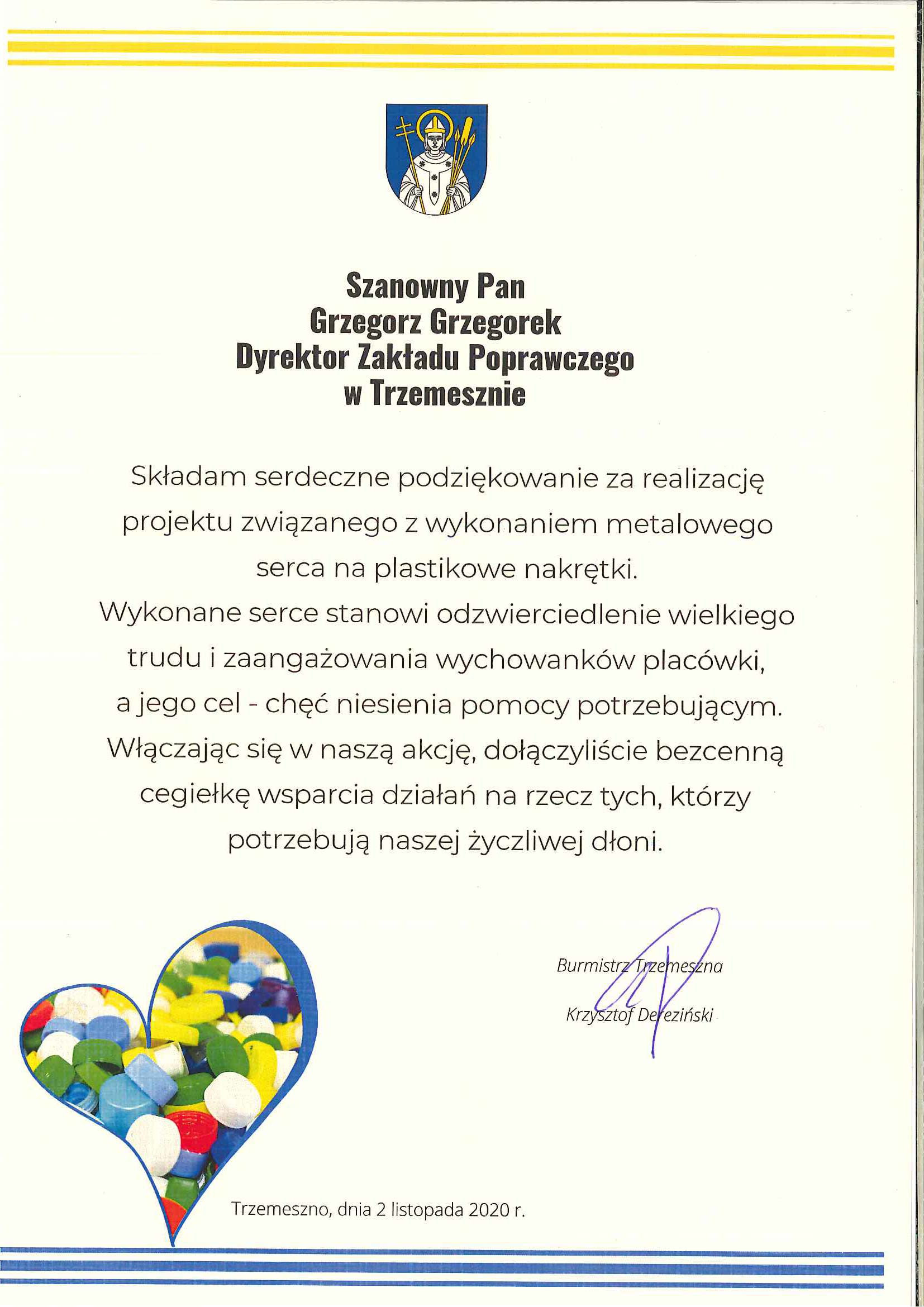 Otrzymaliśmy podziękowanie za wykonanie metalowego serca na plastikowe nakrętki przez naszych wychowanków.