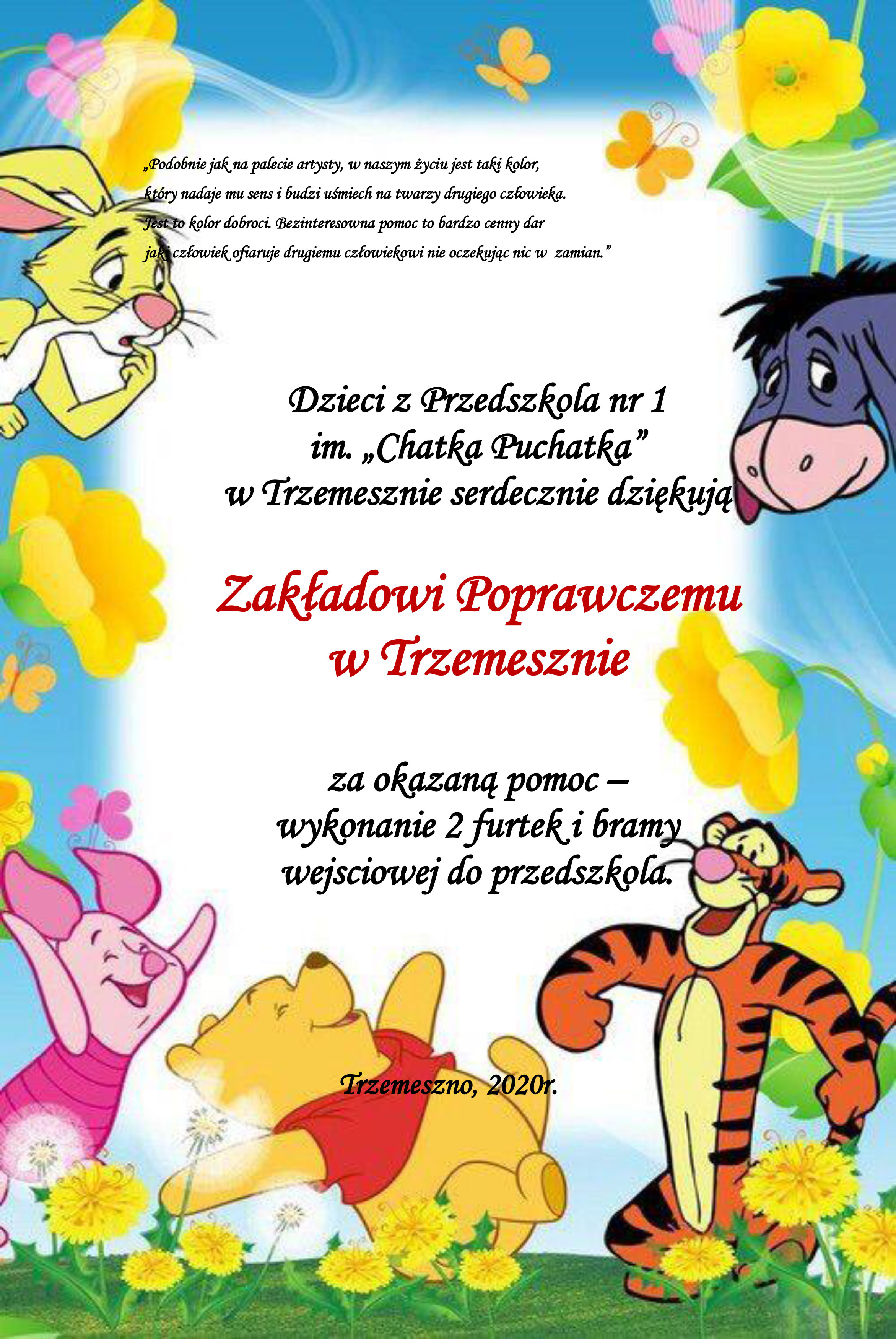 Za okazaną pomoc przy zabezpieczeniu ogrodzenia budynków przedszkola poprzez wykonanie bramy wjazdowej i dwóch furtek.